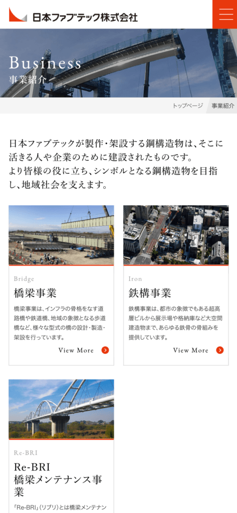 サイトを訪れた人に日本ファブテック様の仕事がひと目で伝わるよう、高品質な写真で大型の工場や従業員の様子を掲載しています。仕事と人にフューチャーし、長年使われている工場や働く人たちの背中から「歴史に残る仕事」を表現しています。