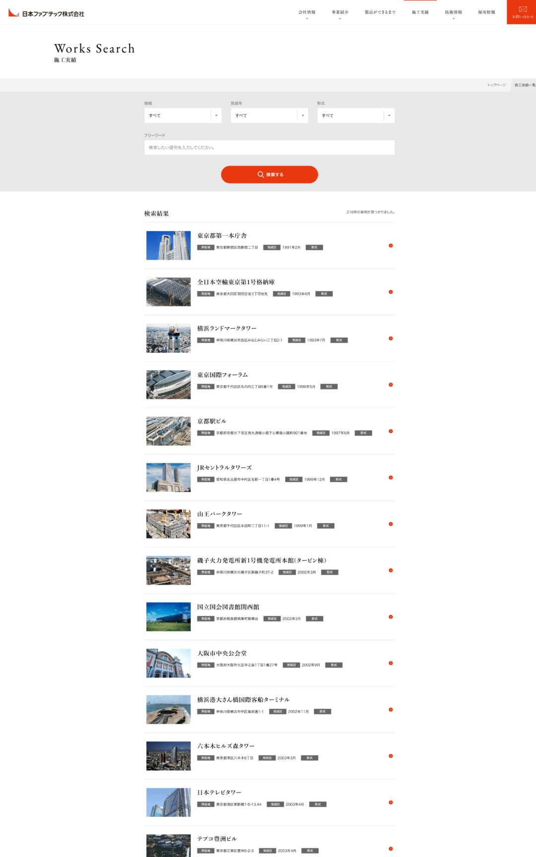 シンプルな使用感のサイトの中でも、施工実績のページではフリーワード検索や絞り込みなどで機能を充実させ、利用者が知りたい情報を探しやすくしました。
