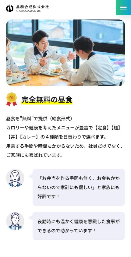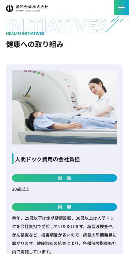 昌和合成様は、健康経営やカーボンニュートラルなど、さまざまな取り組みを推進されています。また、福利厚生の種類が豊富で、社員の皆様の満足度がとても高い様子でした。こうした会社の魅力を分かりやすく整理し、閲覧者に伝わるように工夫しました。